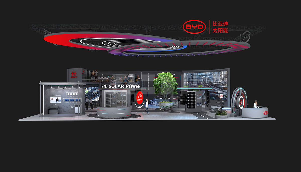 本次"比亞迪太陽能"展位在上海新國際展覽中心E1館-310,占地面積為500㎡,展位紅藍漸變色彩的強烈碰撞、大面積灰色調的運用,彰顯了比亞迪太陽能創新、大膽、前衛的展臺設計風格,體現了比亞迪太陽能勇于進取的精神,